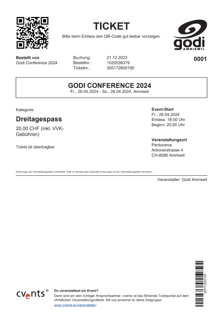 Ab Januar bekommst du an den Godi-Anlässen im Pentorama das GC24-Ticket zum Preis von CHF 20.-. Ebenfalls sind Tickets über die Trägerkirchen im Vorverkauf erhältlich.